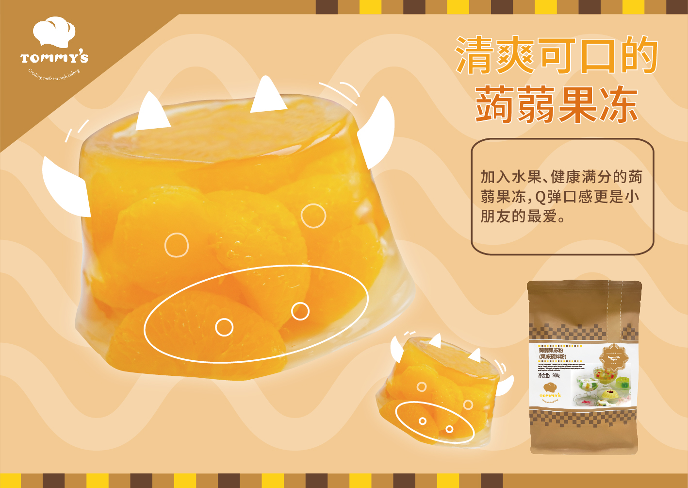 软Q有口感。蒟蒻果冻粉内含有高纤维蒟蒻,是一款健康、低热量的产品。蒟蒻果冻粉可在制作过程中加入果汁调味,当成小朋友们的日常点心,也可以和饮料一起搭配食用,别有一番风味。