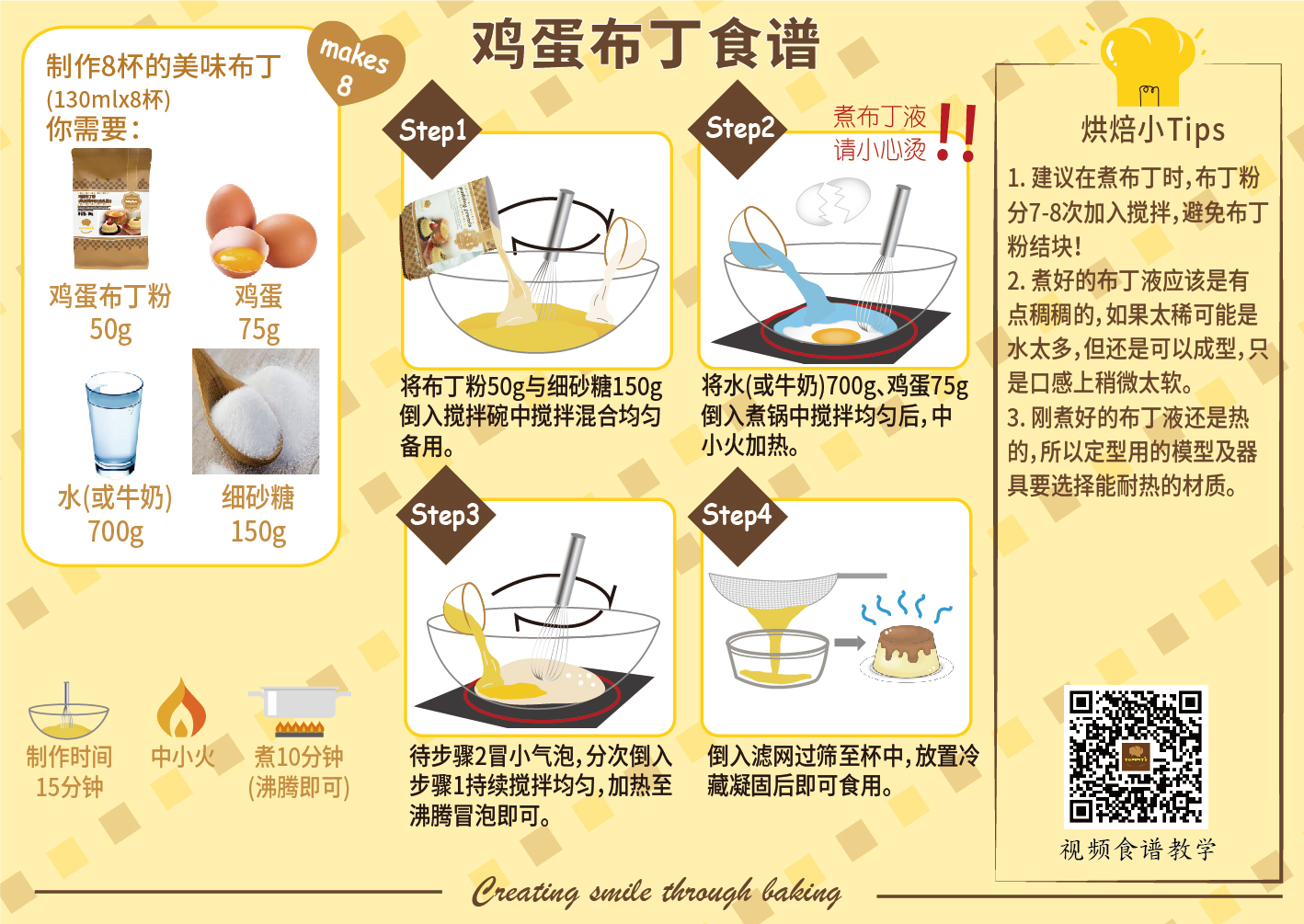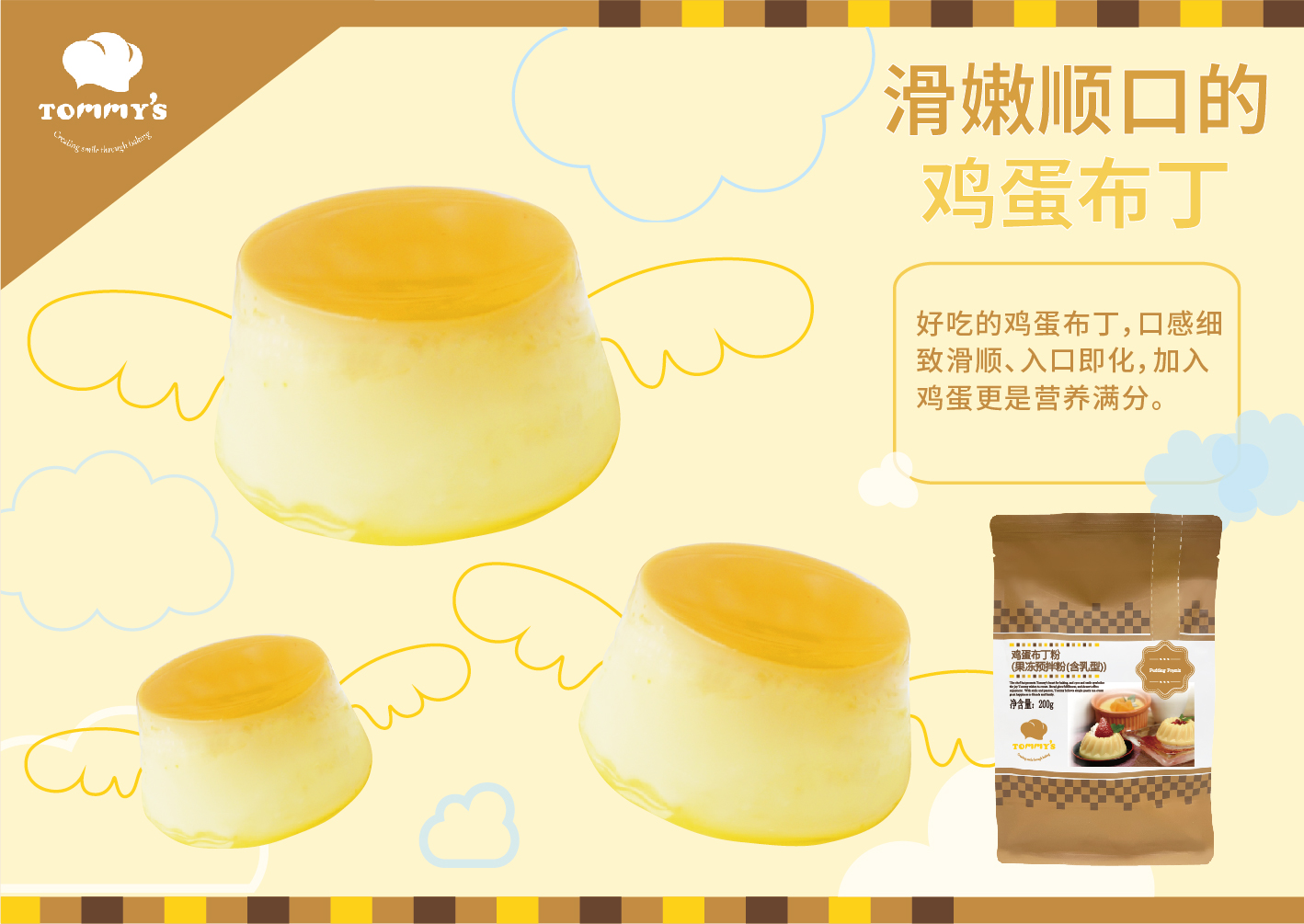 超人气的鸡蛋布丁粉,制作简单方便,加入鸡蛋更是营养满分。成品口感细致滑顺、入口即化,可变化多种口味,亦可使用造型模具,变化出多种款式的布丁。