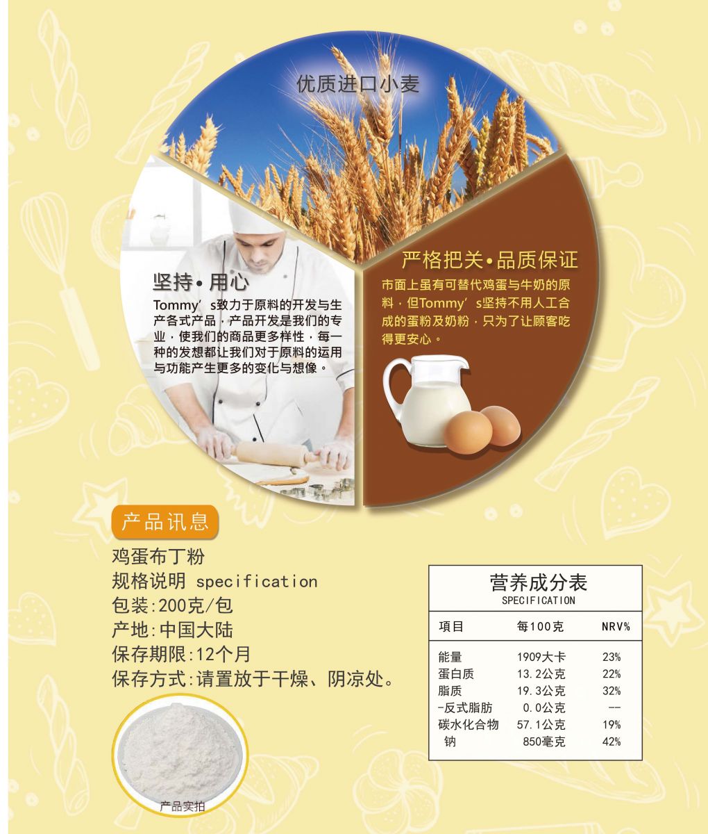 羟丙基淀粉、糖、面粉、全脂奶粉、酦粉(酸性焦磷酸钙、碳酸氢钠、小麦淀粉、磷酸二氢钙)、盐、小麦淀粉、乳化剂(乳酸硬脂酸钠、脂肪酸甘油酯)、黄豆粉、柠檬酸。