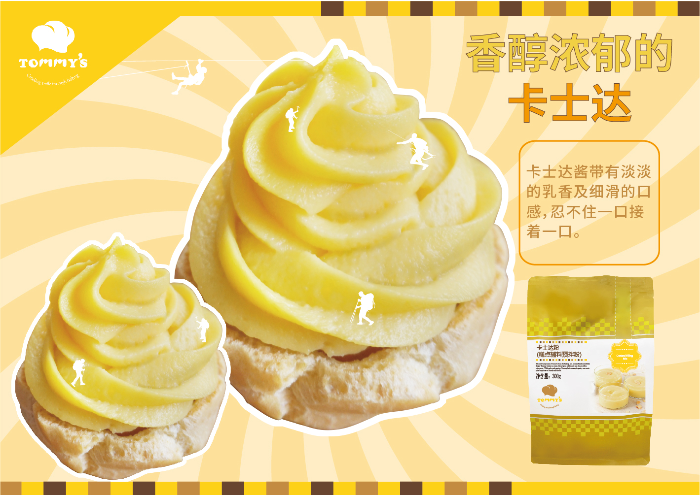卡士达粉作法简单方便,制作出来的卡士达馅软硬适中,带有淡淡的乳香及细滑的口感,可加入可可粉、抹茶粉等变化口味。卡士达馅的耐冻性佳,可作为冷冻面团中的内馅夹层,就算经过长时间的冷冻(冷藏),仍能确保内馅的品质稳定。