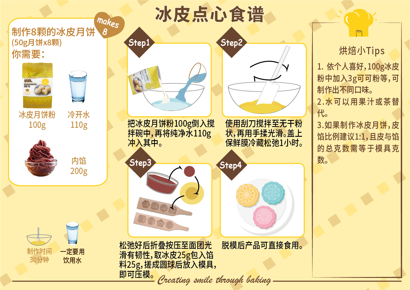建议在搅拌冰皮粉及冷开水时,白油分2-3次加入搅拌,避免白油无法与冰皮粉跟水融合哦!